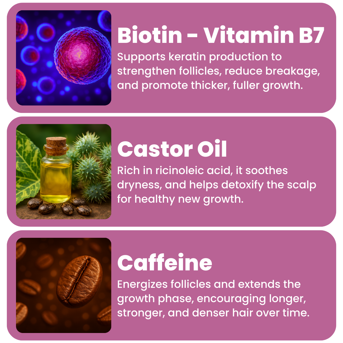 Biotin supports keratin production to strengthen hair, while caffeine stimulates follicles and helps extend the natural growth phase.